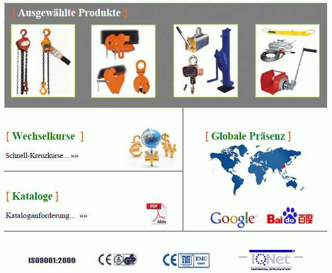Hebezeuge, Handhebezeuge, Stirnradflaschenzüge, Ratschzüge, Hebelzüge, Hubzüge, Ratschenflaschenzug, Handhebelzüge, Elektrokettenzüge, Elektroseilzüge, Seilzuggeräte, Handbetriebener Mehrzweckzug, Handfahrwerk, Haspelfahrwerk, Elektrofahrwerk, Trägerklemmen, Spindel-Trägerklemme, Hebeklemmen, Vertikal-Hebeklemme, Horizontal-Hebeklemme, Profilrohrklemme, Faß-Klammer, Fasszwinge, Betonrohr-Transportgehänge, Rohrklemme, Kranwaagen, Dynamometer, Permanent-Lasthebemagnete, Hubmagnete, Krangabeln, Hydraulischer Werkstattkran, Krangabeln, Hebebänder, Polyesterrundschlingen, Rundschlingen, Ladungssicherung, Ratschengurte, Zurrgurte, Spanngurte, Handseilwinden,Bremswinde, Elektroseilwinden, Elektroseilwinde |